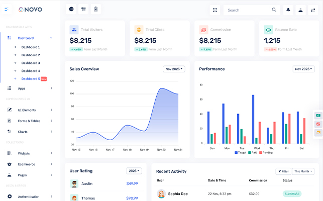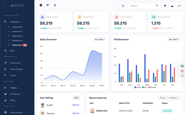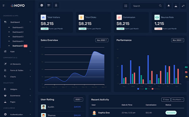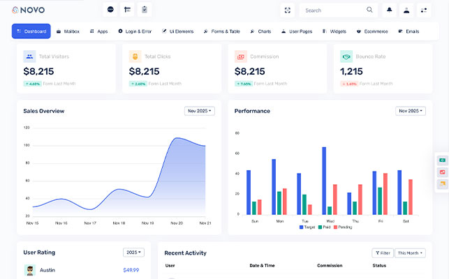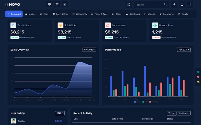 Novo is one of the unique modern admin dashboard template with Frontend HTMLTemplate. Premium admin dashboard with high endless possibilities.